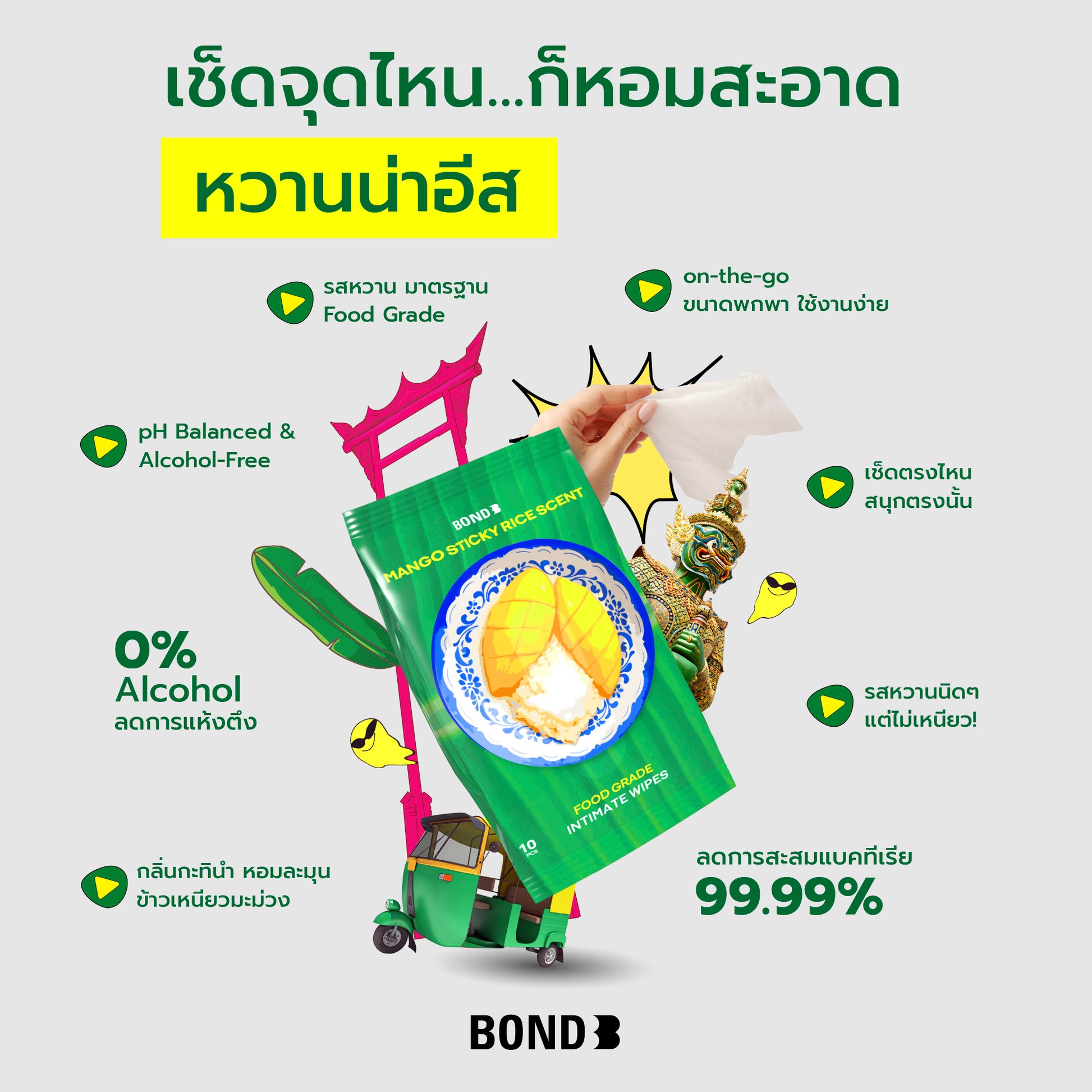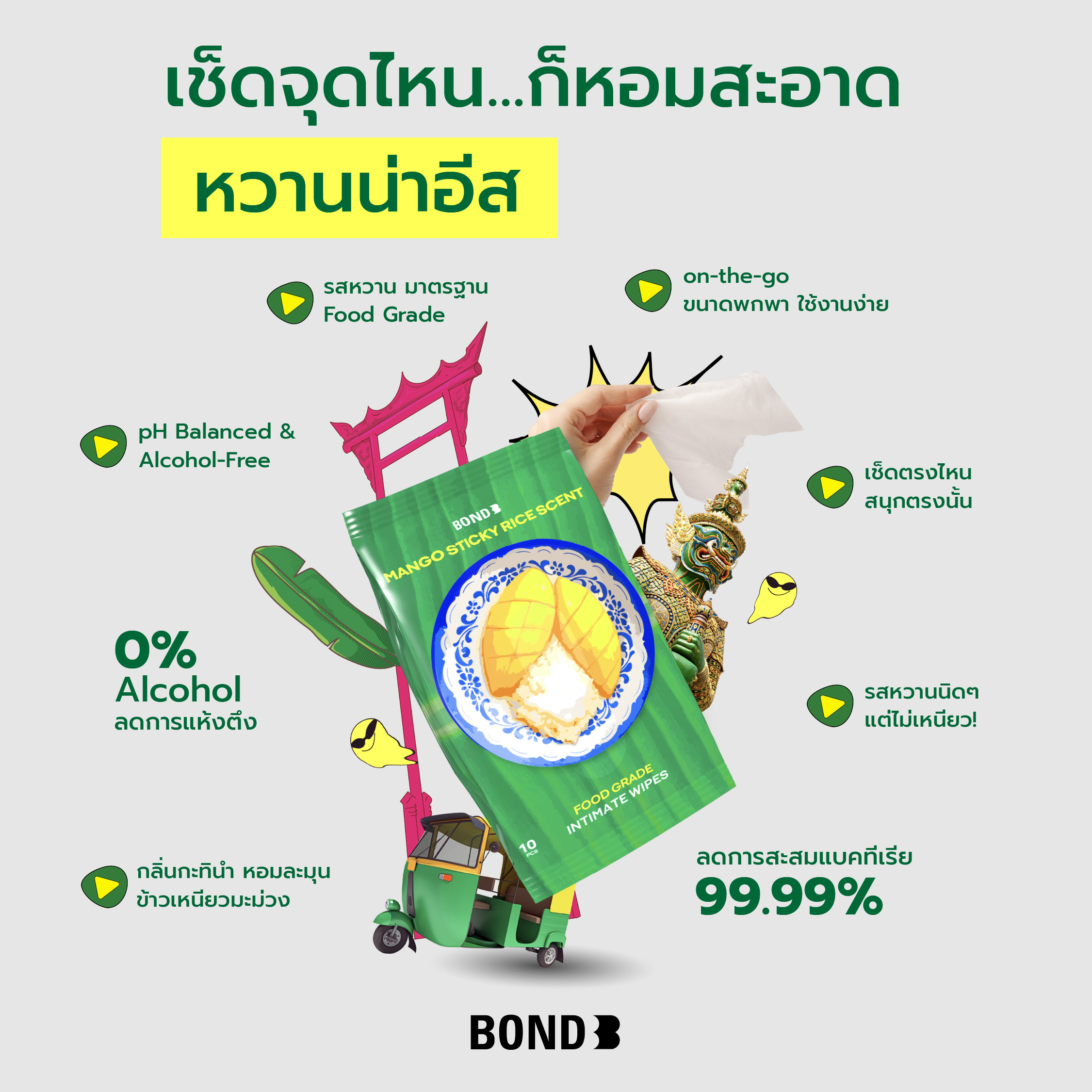 ผ้าเช็ดทำความสะอาดเฉพาะที่หอม… หวาน… มัน… ทุกครั้งที่เช็ด! กับสูตร Limited Edition กลิ่นข้าวเหนียวมะม่วง ของหวานไทยที่ดังไกลระดับโลกเติมสีสันสดชื่นได้ทุกที่ ทุกเวลาลดการสะสมแบคทีเรีย 99.99% พร้อมค่า pH Balanced และปราศจากแอลกอฮอล์อ่อนโยนต่อผิว ให้วันธรรมดาของคุณสนุก มีรสชาติและไม่เหมือนใคร! INDULGE IN THE SEASONAL FL AVOR